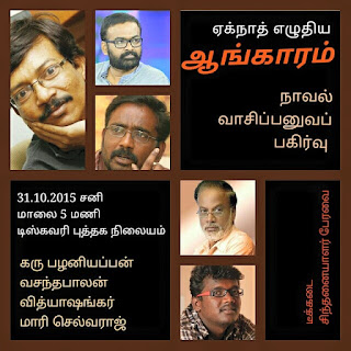 எனது 'ஆங்காரம்' நாவல் பற்றி திரு.வசந்தபாலன், திரு.கரு.பழனியப்பன், கவிஞர் வித்யா ஷங்கர் என்கிற துரை, மாரி செல்வராஜ், இயக்குனர் கவிதா பாரதி ஆகியோர் இன்று மாலை 5 மணிக்கு பேசுகிறார்கள். முடிந்தால் கலந்துகொள்ளுங்கள்.